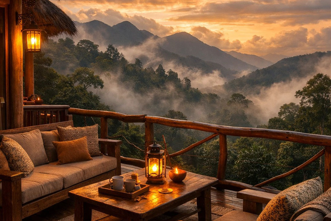 The lodge offers well-appointed cottages and rooms that blend harmoniously with the surrounding forest. Each unit features en-suite bathrooms with hot showers, comfortable beds, and private verandas overlooking the lush rainforest and distant hills.
